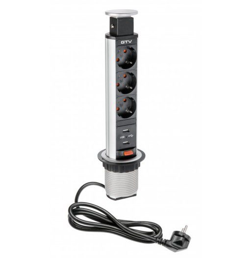 El enchufe para muebles extraíble es una de las soluciones más populares del mercado. Se adapta a espacios pequeños: escritorios pequeños, mesas, encimeras de cocina. Cuando se extrae, hay tres tomas de corriente y dos puertos USB para cargar dispositivos móviles. El enchufe está acabado con una estética tapa. Disponible en dos colores universales: negro y plata.