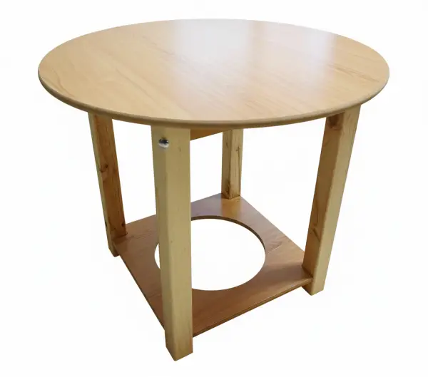 Mesa camilla redonda de madera con tarima para brasero, fabricación propia, con patas de madera de pino en distintas medidas. Son mesas de fácil montaje y desmontaje. Te permite decorar cualquier estancia de tu hogar. Combina tu mesa camilla con un espejo o mantel para dar tu toque personal.
